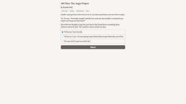 Take on the role of Agent 180, an elite superspy whose keen instincts, cutting-edge gadgets, and quick wit have always ensured his success in the field. After a personal tragedy turns your life upside down, your next mission will take you beyond your limits. In 180 files: the Aegis projectA 184,000-word interactive spy thriller by Karelia Hall, you’re tasked with investigating the death of a former informant linked to a shadowy corporation. As you infiltrate, you will uncover dangerous secrets and confront echoes of your own past. Balancing loyalty and survival, you must decide whether to follow orders to the letter or risk it all by making a deal with the devil. This fully text-based experience invites players to fully immerse themselves in a gripping narrative driven by their choices, without the aid of graphics or sound effects. Freely customize your agent’s identity, selecting from male, female or non-binary options and a wide range of sexual orientations, including gay, straight, bisexual, demisexual or asexual. Shape Agent 180’s background and tackle missions using a combination of technological know-how, charm, strategy, brute force or sheer courage, backed by a variety of specialized gadgets. Navigate complex relationships, choosing to build genuine connections or manipulate others to your advantage, including potential romances with an intrepid reporter, a charming executive, a brilliant scientist, or even a dangerous enemy agent. As you decide what is most important—the mission, your own survival, or the truth—your choices will determine the fate of not only your career but the world at large.