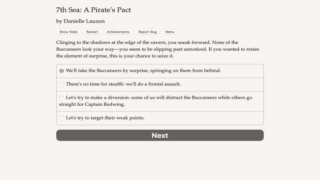7th Sea: A Pirate’s Pact is a 200,000-word interactive adventure novel written by Danielle Lauzon, set in the world of the tabletop role-playing game 7th Sea. It is completely text-based, with no graphics or sound effects, and is powered by the vast, unstoppable power of your imagination.
