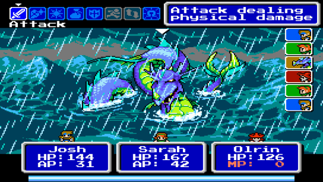 - Engage in turn-based JRPG battles with depth and strategy, inspired by games like Final Fantasy X, Chrono Trigger and Mother 3.