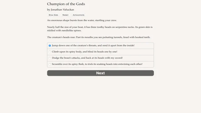 “Champion of the Gods” is an exciting 217,000-word interactive novel written by Jonathan Valuckas, where your choices control the story. It’s completely text-based, with no graphics or sound effects, and is powered by the vast, unstoppable power of your imagination.
