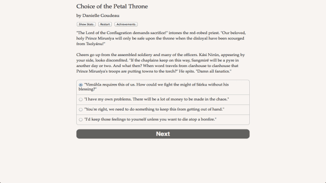 In Empire of the Petal Throne, will you find glory or a knife in your back? “Choice of the Petal Throne” is a 124,000-word interactive fantasy novel by Danielle Goudeau, where your choices control the story. It’s completely text-based, with no graphics or sound effects, and is powered by the vast, unstoppable power of your imagination. The world of MAR Barker’s Tékumel is a fantasy universe like no other, where the cultures of South America, the Middle East, and India collide. The princes and princesses of the Tsolyáni empire compete for their father’s mystical Petal Throne, tearing the nation apart with civil wars and political intrigue. As captain of one of their armies, will you play as a man or a woman, straight gay or bisexual? A brave and outspoken soldier, a hedonistic schemer with a heart of gold or a scheming double agent?