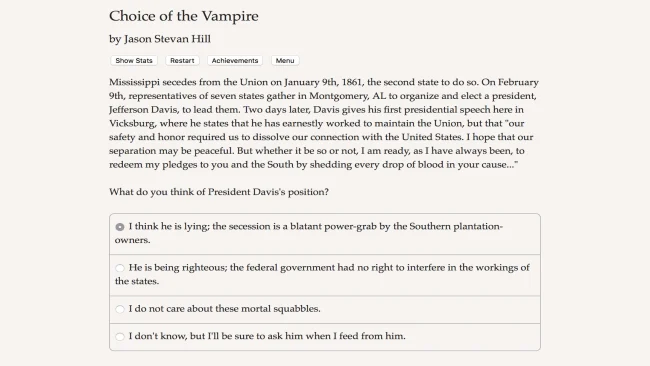 Quench your thirst without turning into a monster! Blessed with the bloody gift of immortality, will you tend to the flock of humanity or manipulate them to your whim? When a bold young country collides with a bold young vampire, who will come out on top? The Vampire’s Choice is an epic four-volume, 850,000-word interactive novel written by Jason Stevan Hill. It’s completely text-based, with no graphics or sound effects, and is powered by the vast, unstoppable power of your imagination. Begin your vampire journey in Volume One, The Battle of New Orleans, set in antebellum Louisiana, where your reputation is only as good as your skill with a dueling sword or pistol. Volume Two, The Siege of Vicksburg, continues in the Civil War, at the site of one of the most grueling and decisive battles of the war. When a strange vampire seeks to disrupt Confederate defenses, will you help him, hinder him, or consume him?