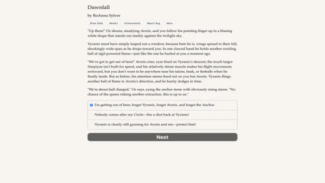 Find true love and family with a pirate crew at the edge of the universe, where aliens, ghosts and portals open the space between worlds… and your heart. You are a Navigator, someone who creates and guards portals from one dimension to another, wary of the liminal sea between them. Your universe is made up of two worlds: one contains the magical world of Zephyria and the other, the dystopian space station Eclipse. The worlds are balanced, until one day, an explosive disaster, a deadly energy storm, and an infamous pirate, the Ghost Queen, turn your life upside down and plunge you into a race to save both worlds. Dawnfall is a 232,000-word interactive romance novel by RoAnna Sylver, where your choices control the story. It’s completely text-based, with no graphics or sound effects, and is powered by the vast, unstoppable power of your imagination. So what happens when you discover that there aren’t just two dimensions to save, but three? Is it worth sacrificing one to save two worlds? Will you find love with the crew of the Dawnfall or bring these pirates to justice? Should connections between universes, people, and lives be forged and protected, or severed for the greater good?