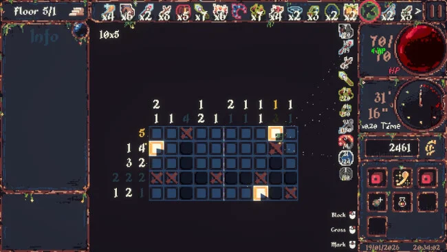 CiniCross es un roguelite de fantasía oscura centrado en rompecabezas de nonogramas, también conocidos como Griddlers. Los jugadores descienden a una mazmorra maldita donde cada acertijo resuelto los acerca a enemigos temibles y mayores recompensas. A medida que aumenta la profundidad de la mazmorra, también aumenta la complejidad de los rompecabezas, que varían en tamaño desde cuadrículas de 5×5 a 20×20. Los nonogramas y las mazmorras generadas por procedimientos garantizan una experiencia única en cada partida, con múltiples caminos en cada piso que culminan en un difícil encuentro con el jefe. Cada jefe tiene habilidades distintas que obligan a los jugadores a adaptar sus estrategias y repensar su enfoque a los acertijos. En el camino, descubra tiendas, fogatas y otros lugares que brindan un apoyo esencial en su viaje. Los artefactos y elementos juegan un papel crucial en la configuración del juego, proporcionando efectos poderosos como llenar columnas automáticamente, aumentar las recompensas o ralentizar el tiempo. La combinación de estos efectos crea sinergias devastadoras que pueden cambiar el rumbo de una carrera. Cada decisión, error y momento perdido tiene consecuencias, por lo que la gestión del tiempo y la planificación cuidadosa son esenciales. La muerte es inevitable, pero cada fracaso brinda una nueva oportunidad para perfeccionar tus tácticas, recolectar nuevos tesoros y profundizar en las profundidades de la mazmorra. CiniCross ofrece una combinación desafiante de resolución de acertijos y progresión roguelite que recompensa la perseverancia y el pensamiento estratégico.
