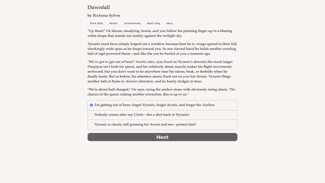 Encuentra el verdadero amor y una familia con una tripulación pirata en los confines del universo, donde los extraterrestres, fantasmas y portales abren el espacio entre los mundos… y tu corazón. Eres un Navegante, alguien que crea y guarda portales de una dimensión a otra, desconfiando del mar liminal entre ellos. Tu universo se compone de dos mundos: uno contiene el mundo mágico de Zephyria y el otro, la estación espacial distópica Eclipse. Los mundos están en equilibrio, hasta que un día un desastre explosivo, una tormenta de energía mortal y un pirata infame, la Reina Fantasma, trastornan tu vida y te sumergen en una carrera para salvar ambos mundos. Dawnfall es una novela romántica interactiva de 232.000 palabras escrita por RoAnna Sylver, en la que tus elecciones controlan la historia. Está completamente basado en texto, sin gráficos ni efectos de sonido, y está impulsado por el vasto e imparable poder de tu imaginación. Entonces, ¿qué sucede cuando descubres que no hay sólo dos dimensiones que salvar, sino tres? ¿Vale la pena sacrificar uno para salvar dos mundos? ¿Encontrarás el amor entre la tripulación del Dawnfall o llevarás a estos piratas ante la justicia? ¿Las conexiones entre universos, personas y vidas deben forjarse y protegerse, o romperse por el bien común?