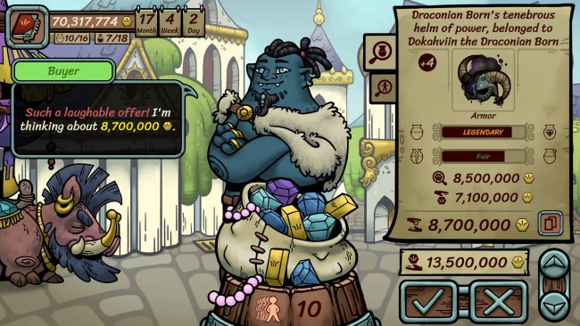 ¡Bienvenido al Imperio Pecuniano, comerciante ambulante! Dirígete entre nuestras numerosas ciudades, amplía tu colección de bienes y aumenta tu riqueza. Si tu talento y tus habilidades son lo suficientemente agudos, ¡puedes tener la oportunidad de ganar la misión del Comerciante Errante y demostrar que TÚ eres el mejor comerciante de la ciudad! A lo largo de tu viaje, emprende misiones para los lugareños, encuentra artículos únicos para vender y reúne un grupo de compañeros de viaje, pero ten mucho cuidado: no todo es lo que parece en esta tierra pacífica y próspera. Todo lo que construimos en Dealer’s Life y Dealer’s Life 2 ha sido mejorado y adaptado al entorno de fantasía en el que nos preparamos para hacernos ricos… ¡Por tercera vez! ¡El revolucionario Trade Engine está de regreso y nunca ha estado mejor! Cada acción que usted tome afectará el resultado de las negociaciones. ¡Estudie a sus clientes, observe sus acciones y utilice sus habilidades de distribuidor para cerrar los mejores tratos! Sin embargo, hay un problema: en lugar de tener artículos falsificados, ahora hay más en juego porque un error podría llevarte a comprar y vender artículos malditos. Debes tener cuidado cuando te encuentres con estos bienes, ya que podrían maldecirte si los conservas durante demasiado tiempo, ¡y solo un clérigo puede deshacerte de ellos! Es mejor mejorar su perspicacia o prepararse para dormir con un ojo abierto por precauciones de seguridad. ¡Beneficio, beneficio, beneficio! Perfeccione sus habilidades de regateo y su carisma para influir en los clientes y ganar mucho dinero. Visite la casa de subastas, interactúe con los clientes y almacene los productos más populares. A medida que transportas tu tienda por todo el mundo, es posible que te encuentres con personajes recurrentes que puedan recordar tus elecciones y actuar en consecuencia. ¿Elegiste ayudar a este pobre comerciante cuando estaba pasando apuros? Él te recompensará por tu buena acción dándote muchos obsequios y ventajas que te ayudarán en tu aventura. Oh, espera… ¿Elegiste ignorarlo, o peor aún, aprovecharte de él para eliminar la competencia? ¡Así que será mejor que corras porque intentarán pagarte por el mismo trato!