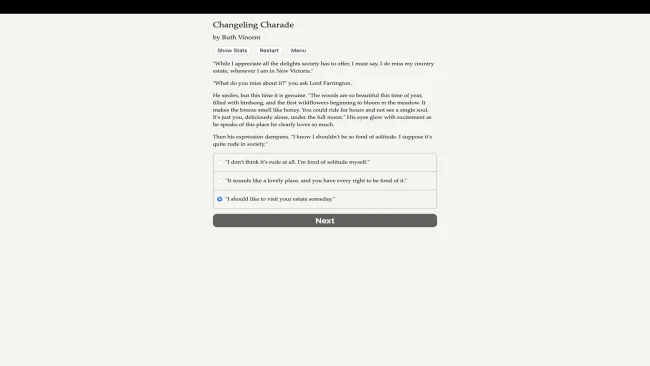 Enfilez un costume magique pour trouver le véritable amour ! En tant que changeling, resterez-vous parmi la noblesse humaine ou rejoindrez-vous la révolution des fées ? Changeling Charade est un roman d’amour surnaturel interactif de 450 000 mots de Ruth Vincent, dans lequel vos choix contrôlent l’histoire. Il est entièrement basé sur du texte, sans graphiques ni effets sonores, et est alimenté par la puissance vaste et imparable de votre imagination. La magie est illégale dans la ville de New Victoria. Cela signifie que les êtres surnaturels (loups-garous, djinns, fées, etc.) ont lancé un commerce clandestin de potions et de sorts. En tant que fée pauvre, vous avez rejoint ce métier dans l’espoir de gagner une vie meilleure pour vous et votre famille : vous êtes devenue une changeling, vous transformant pour ressembler à la noble humaine Lady Constance Weatherby. En vivant dans la luxueuse demeure de Lady Constance, vous pourrez porter les plus belles tenues, assister à des bals masqués, vous faire des amis parmi la noblesse, apprendre les arts auprès d’un professeur expert et même gagner une audience avec la reine elle-même. Mais la haute société de New Victoria ne se résume pas à ce que l’on voit, et vous n’êtes pas le seul à cacher un secret magique. Quelle maison noble cache un loup-garou ? Lequel a des liens suspects avec le marché louche des potions ? Non seulement cela, mais il y a aussi des fées révolutionnaires qui se battent pour renverser les lois interdisant la magie et les espions parmi la noblesse travaillant pour la même cause. Allez-vous les rejoindre ? Ou resterez-vous dans la vie humaine confortable que vous vous êtes créée ? Et où trouveras-tu l’amour ? Avec le comte distingué avec qui la mère autoritaire de Lady Constance espère associer sa fille ? Le noble fringant avec un renard de compagnie et un sourire espiègle assorti ? Le tuteur sans le sou, artistique et sincère ? Ou même la fée révolutionnaire idéaliste qui dirige la tâche de restaurer la magie ?