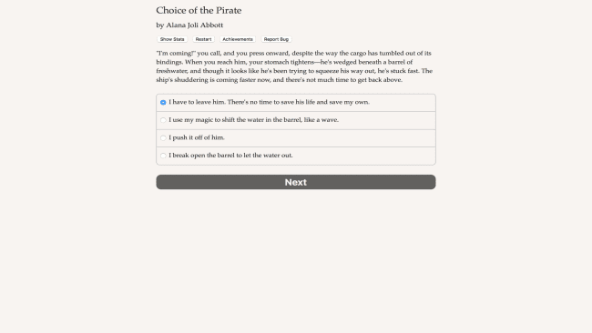 Pillez les vaisseaux fantômes à la recherche de trésors maudits ! Combattez la Crown Navy, les monstres marins et d’autres pirates assoiffés de sang dans le cadre d’une mission visant à rivaliser avec le roi des pirates lui-même ! « Choice of the Pirate » est un roman interactif au rythme effréné écrit par Alana Joli Abbott, auteur de « Choice of Kung Fu » et « Showdown at Willow Creek ». Vos choix contrôlent l’histoire. Il est entièrement basé sur du texte (165 000 mots, sans graphiques ni effets sonores) et alimenté par la puissance vaste et imparable de votre imagination. Il passe de marin nettoyant le pont à commandant d’une flotte pendant cinq années de piraterie dans le paradis tropical de la mer Lucaya. Maîtrisez les vents avec la magie ou montez à bord des navires ennemis avec votre machette entre les dents. Jouerez-vous en tant qu’homme, femme ou non binaire ? Vous recherchez une relation amoureuse en tant que gay, hétérosexuel, bisexuel ou poly, ou recherchez des amitiés et des alliances ? Rejoindrez-vous la Couronne en tant que corsaire et maîtriserez-vous les pirates ? Allez-vous parlementer avec le Roi Pirate pour protéger les Lucayens de la domination de la marine ? Ou allez-vous affronter le Roi Pirate en duel et revendiquer son pouvoir pour vous-même ? Attachez votre ceinture et embarquez pour l’aventure !