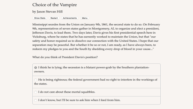 Étanchez votre soif sans vous transformer en monstre ! Bénéficiant du don sanglant de l’immortalité, allez-vous vous occuper du troupeau de l’humanité ou le manipuler à votre guise ? Lorsqu’un jeune pays audacieux entre en collision avec un jeune vampire audacieux, qui l’emportera ? The Vampire’s Choice est un roman interactif épique en quatre volumes et 850 000 mots écrit par Jason Stevan Hill. Il est entièrement basé sur du texte, sans graphiques ni effets sonores, et est alimenté par la puissance vaste et imparable de votre imagination. Commencez votre voyage de vampire dans le premier volume, La bataille de la Nouvelle-Orléans, qui se déroule dans la Louisiane d’avant-guerre, où votre réputation est aussi bonne que votre habileté avec une épée ou un pistolet de duel. Le deuxième volume, Le siège de Vicksburg, se poursuit dans la guerre civile, sur le site de l’une des batailles les plus épuisantes et décisives de la guerre. Lorsqu’un étrange vampire cherche à perturber les défenses confédérées, allez-vous l’aider, le gêner ou le consumer ?
