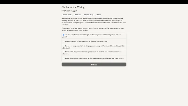 Naviguez vers une terre de dieux et de géants ! Maniez votre épée, vos paroles et votre magie pour prendre votre place parmi les chefs islandais et forger votre héritage d’honneur dans cette histoire tissée à partir de sagas nordiques, de mythes et de la vie de vrais Islandais du Xe siècle. The Viking’s Choice est un roman fantastique historique interactif de 306 000 mots de Declan Taggart, dans lequel vos choix contrôlent l’histoire. Il est entièrement basé sur du texte, sans graphiques ni effets sonores, et est alimenté par la puissance vaste et imparable de votre imagination. En l’an 910 de notre ère, d’innombrables navires vikings traversent les océans gelés du nord de l’Europe à la recherche de fortune, de gloire, de commerce et de terres. Le vôtre est l’un d’entre eux, transportant des colons vers l’île isolée d’Islande. Avec votre grande ferme à entretenir et vos partisans à gouverner, c’est votre chance de construire quelque chose de nouveau à partir de ces terres accidentées. Il y a des défis à chaque étape. Les autres futurs patrons sont tout aussi avides de gloire que vous, et vous devez défendre votre part de richesse et d’honneur, en particulier contre le rival lésé qui essaie constamment de vous contrecarrer. Les croyances nouvelles et anciennes se disputent l’âme des Islandais et le pouvoir politique que chaque religion peut avoir. L’hiver long et sombre est à vos portes, menaçant de faim et de maladie. Et vous devrez affronter non seulement les habitants humains de l’Islande, mais aussi un certain nombre de créatures mystérieuses : des elfes, des trolls, des géants, des cadavres ambulants et même les dieux eux-mêmes. Augmentez votre richesse en effectuant des raids, en entretenant soigneusement la terre ou en vous engageant dans des échanges intelligents. Travaillez votre magie pour éliminer les obstacles sur votre chemin et obtenir la bénédiction des esprits. Si vous échouez, le pouvoir royal de Norvège revendiquera votre terre comme sienne, mais si vous réussissez, vous trouverez la gloire éternelle.
