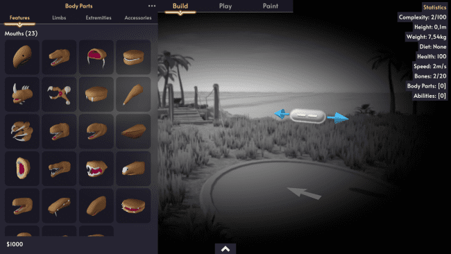 - En mode construction, vous pouvez personnaliser la forme de votre créature en manipulant sa colonne vertébrale et en attachant des parties du corps transformables. Modifier votre créature modifie ses statistiques (par exemple poids, vitesse, santé, etc.) et attacher certaines parties du corps lui confère des capacités spéciales (par exemple voler, nager, mordre, etc.).