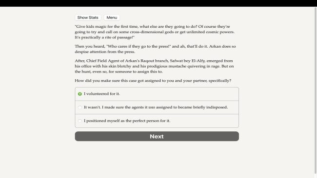 Você passou anos disfarçado como humano, infiltrando-se na mágica organização policial Arkan na cidade de Raqout, um movimentado porto entre mundos onde abundam segredos. Outrora um diabrete de outro plano, sua magia foi retirada por uma entidade poderosa conhecida como “a Misericórdia” como punição por crimes passados, forçando você a viver entre os humanos. Apesar disso, você recuperou magia suficiente para superar os humanos comuns e, armado com talsama (magia acessível a todos os humanos), junto com sua inteligência aguçada, dispositivos e conhecimento interior, você subiu na hierarquia Arkan. Seu companheiro cumpridor das regras não tem conhecimento de sua verdadeira natureza ou de seu motivo mais profundo: recuperar a magia que foi roubada de você. Agora, depois de anos de preparação, você está pronto para invadir o cofre de Arkan para recuperar o que é seu por direito, mas o cofre contém apenas uma parte de sua magia, e mais mistérios se revelam à medida que outros com magia roubada desaparecem sem deixar vestígios. Mergulhe em uma fantasia urbana histórica ricamente tecida, cheia de intrigas, traições e agendas ocultas enquanto você navega pelos becos escuros e corredores políticos de Raqout. Participe de assaltos ousados, abra cofres mágicos com feitiços ou tecnologia e persiga seus inimigos pelas ruas da cidade em carros incríveis. Negocie com necromantes, afareet, djinn, gangsters e burocratas, descobrindo segredos que muitos querem manter enterrados, ao mesmo tempo que evitam o olhar atento de Mercy. Suas escolhas moldam a história neste extenso romance interativo de 600.000 palavras de Athar Fikry, onde você pode explorar várias identidades e relacionamentos, do romance à amizade, e decidir se deseja manter seu verdadeiro eu oculto ou revelá-lo. Recupere seus modos maliciosos, use sua magia roubada e decida onde está sua lealdade em uma cidade onde nada é o que parece e impostores espreitam em cada sombra.