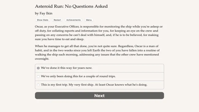 Capitão de um navio mercante navegando pelas rotas perigosas entre a Terra, Marte e o cinturão de asteróides, você enfrenta um contrato de alto risco com ordens estritas: não abra a carga misteriosa, não interfira com seu manipulador e não faça perguntas. Em Corrida de asteróides: sem perguntasUm romance interativo de 325.000 palavras de Fay Ikin, você deve gerenciar recursos limitados, uma equipe desesperada e um homem de empresa disfarçado espionando cada movimento seu. O Sistema Solar é um lugar perigoso, cheio de policiais corruptos, cultistas e terroristas ansiosos por explorar qualquer fraqueza. Suas escolhas moldarão sua jornada à medida que você equilibra a manutenção do navio, a saúde da tripulação e a pontualidade enquanto navega nas tensões políticas entre blocos de poder corporativos, facções anarquistas e autoridades policiais. Jogue como não binário, feminino ou masculino e explore relacionamentos complexos, incluindo opções românticas que abrangem todos os gêneros e orientações. Decida se deseja proteger os segredos de sua tripulação, juntar-se aos anarquistas e seu enigmático líder ou servir às megacorporações e legisladores com fins lucrativos. Suas lealdades e decisões determinarão não apenas sua sobrevivência, mas também o destino daqueles que estão sob seu comando. Com seis meses para completar a sua missão, cada escolha conta nesta aventura baseada em texto que desafia os seus princípios, lealdade e astúcia num universo vasto e implacável onde a confiança é escassa e o perigo está sempre presente.