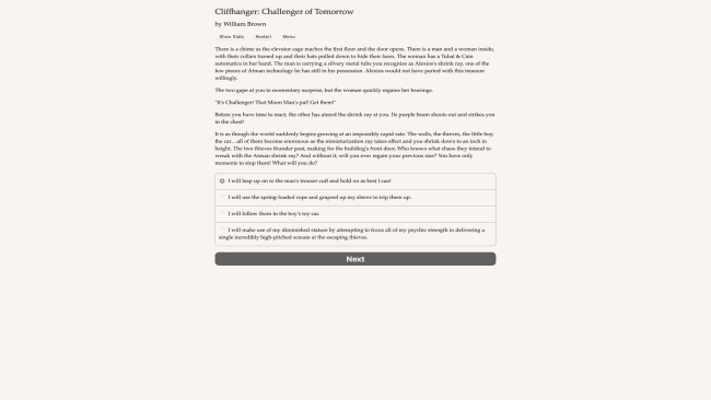 Derrote fascistas e desvende conspirações nesta aventura explosiva ambientada em um mundo retro-futurista da década de 1930 cheio de aeronaves, carros velozes e ação com dois punhos! Cliffhanger: Challenger of Tomorrow é um romance interativo de 300.000 palavras de William Brown, autor de Os Mistérios do Barroco. É totalmente baseado em texto, sem gráficos ou efeitos sonoros, e é alimentado pelo vasto e imparável poder da sua imaginação. Aqui, aventureiros mascarados e encapuzados, com armas de raios e botas-foguete, percorrem as brilhantes ruas Art Déco de Manhattan. Sinistros gênios do crime planejam a partir de covis em ilhas tropicais. Dinossauros chutam e rugem em planaltos de selva envoltos em névoa. Arqueólogos intrépidos descobrem segredos incríveis e maldições terríveis sob as areias do deserto. Ladrões mestres planejam assaltos ousados nos cassinos reluzentes de Mônaco. E você? Você é Challenger, o aventureiro mais famoso do mundo ou, se preferir, o canalha mais infame. Você foi criado como órfão pelo Dr. Cosmos Zeta em seu Tomorrow Institute, onde ele e sua excelente equipe de cientistas desenvolveram “raios zeta”, que fornecem energia gratuita para o mundo inteiro e concedem poderes misteriosos a alguns sortudos. Mas agora, o Dr. Zeta foi assassinado diante de seus olhos e substituído por um sósia, que o acusa de tentativa de homicídio. Para limpar seu nome e vingar a morte de Zeta, você terá que perseguir o assassino por todo o mundo… e além! Você defenderá a Terra contra um gênio sinistro? Irá esmagar o eixo do fascismo que está a causar estragos em toda a Europa? Você descobrirá a chocante verdade sobre os raios zeta? Só há uma maneira de descobrir! Jogue “Cliffhanger: Challenger of Tomorrow” hoje mesmo!