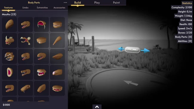 - No modo de construção, você pode personalizar a forma da sua criatura manipulando sua coluna e anexando partes transformáveis do corpo. Alterar sua criatura altera suas estatísticas (por exemplo, peso, velocidade, saúde, etc.) e anexar certas partes do corpo concede habilidades especiais (por exemplo, voar, nadar, morder, etc.).