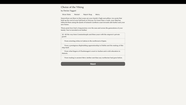 Tanrıların ve devlerin ülkesine yelken açın! İskandinav destanlarından, mitlerinden ve gerçek 10. yüzyıl İzlandalılarının yaşamlarından örülmüş bu hikayede İzlanda’nın şefleri arasında yerinizi almak ve onur mirasınızı oluşturmak için kılıcınızı, sözlerinizi ve sihrinizi kullanın. Viking’in Seçimi, Declan Taggart’ın yazdığı, seçimlerinizin hikayeyi kontrol ettiği 306.000 kelimelik interaktif bir tarihi fantastik romandır. Tamamen metin tabanlıdır, grafik veya ses efekti içermez ve gücünü hayal gücünüzün engin, durdurulamaz gücünden alır. MS 910 yılında sayısız Viking gemisi servet, zafer, ticaret ve toprak arayışıyla Kuzey Avrupa’nın donmuş okyanuslarını geçiyor. Sizinki de onlardan biri, yerleşimcileri uzak bir İzlanda adasına götürüyor. Bakılacak büyük çiftliğiniz ve yönetecek takipçileriniz varken bu, engebeli arazide yeni bir şey inşa etme şansınızdır. Her adımda zorluklar var. Diğer müstakbel patronlar da en az sizin kadar şöhrete açlar ve siz de zenginlik ve şereften payınıza düşeni, özellikle de sizi sürekli engellemeye çalışan mağdur rakibinize karşı korumalısınız. Yeni inançlar ve eskiler, İzlandalıların ruhları ve her dinin sahip olabileceği siyasi güç için yarışıyor. Açlığı ve hastalığı tehdit eden uzun, karanlık kış kapınızda. Ve sadece İzlanda’nın insan sakinleriyle değil aynı zamanda çok sayıda gizemli yaratıkla da yüzleşmelisiniz: elfler, troller, devler, yürüyen cesetler ve hatta bizzat tanrılar. Baskın yaparak, araziyi dikkatle inceleyerek veya akıllıca ticaret yaparak zenginliğinizi artırın. Yolunuzdaki engelleri kaldırmak ve ruhların kutsamasını elde etmek için sihrinizi kullanın. Başarısız olursanız, Norveç’in kraliyet gücü topraklarınızın kendisine ait olduğunu iddia edecek, ancak başarılı olursanız sonsuz zafere ulaşacaksınız.