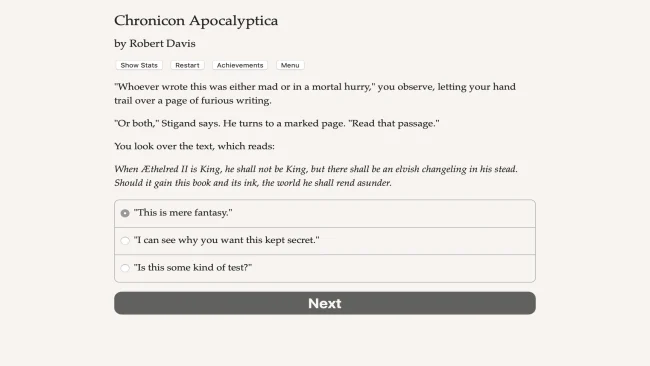 Chronicon Apocalyptica, Robert Davis’in 250.000 kelimelik interaktif bir ortaçağ fantastik romanıdır. Tamamen metin tabanlıdır, grafik veya ses efekti içermez ve gücünü hayal gücünüzün engin, durdurulamaz gücünden alır.